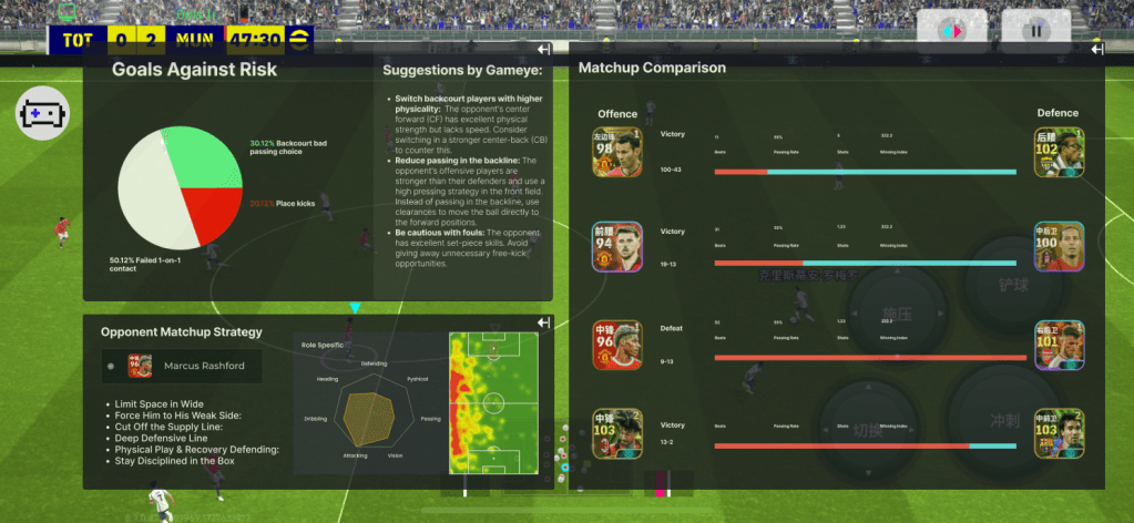 - Live Analytics (eFootball 《實況足球》): Our real-time dashboard for eFootball tracks Goals Against Risk, visualizes opponent formations, and delivers on-the-fly tactical suggestions—whether to press high, drop deep, or switch sub-formations. The Matchup Comparison panel lines up your attackers vs. their defenders (and vice versa), complete with advantage bars and player-stat overlays so you can exploit mismatches instantly.